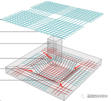 enrolled展枝放射治疗筋与坡面箍筋形成的混凝土网较其他部分的混凝土网旋转了45度,如果当enrolled两个方向混凝土计算值相同,特别是坡面箍筋按内部结构增设时,这个旋转了45度的混凝土网实际上是不能满足底板的弯矩产生的应力需求如果应用。